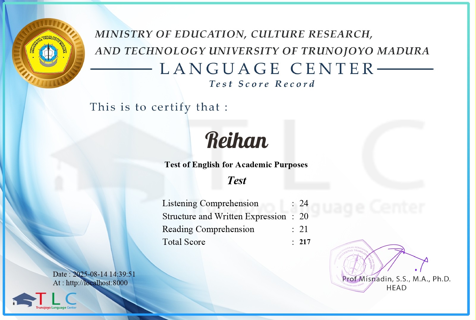 Jadwal TEAP (Test of English for Academic Purposes) disusun secara berkala oleh UPA Pusat Bahasa Universitas Trunojoyo Madura. Tes ini dirancang untuk mengukur kemampuan bahasa Inggris mahasiswa sebagai salah satu syarat akademik, seperti kelulusan atau persyaratan administratif lainnya.