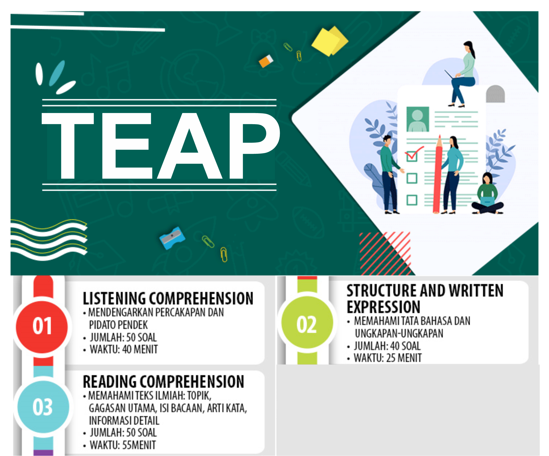 TEAP Test of English for Academic Purposes adalah tes kemampuan bahasa Inggris yang dirancang khusus untuk mengukur keterampilan berbahasa Inggris dalam konteks akademik. Tes ini digunakan untuk mengetahui sejauh mana peserta mampu memahami, menggunakan, serta menganalisis bahasa Inggris dalam kegiatan perkuliahan, seperti membaca teks akademik, menulis esai, mendengarkan materi kuliah, dan berbicara dalam diskusi kelas.